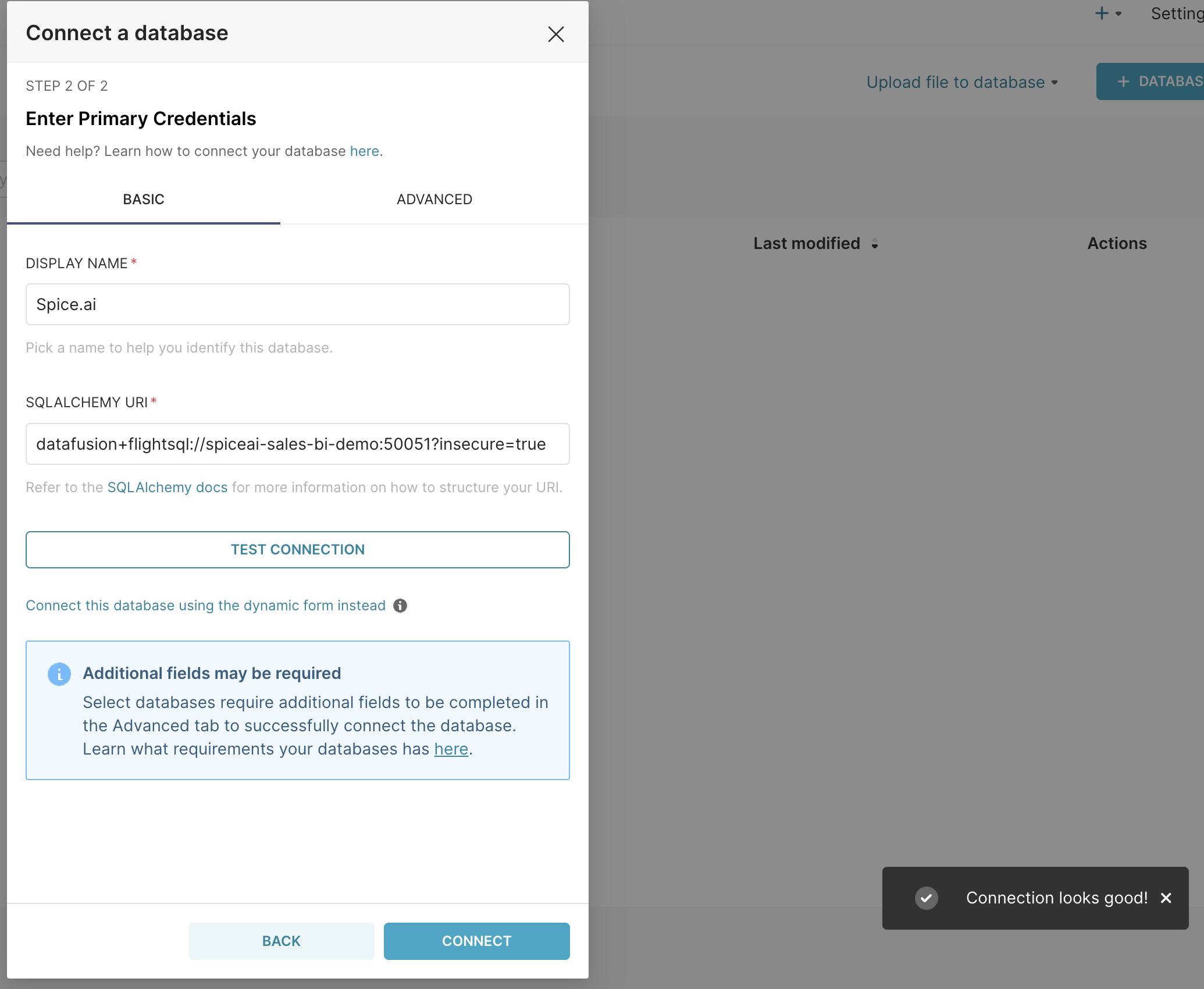 Set the Display Name to Spice and the SQL Alchemy URI to datafusion+flightsql://spiceai_host:[spiceai_port]. Specify ?insecure=true to skip connecting over TLS.
